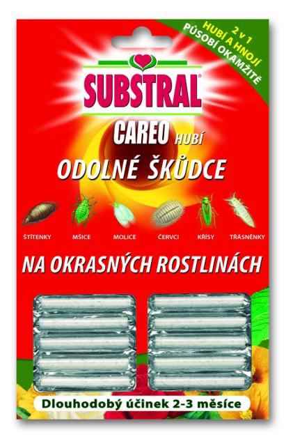 - Substral CAREO pret kaitēkļiem ir kaitēkļu apkarošanas kociņi, kas nodrošina dekoratīvajiem augiemaizsardzību līdz pat 10 nedēļām pret laputīm, laputīm, aizsargspārņiem, tārpu laputīm, tripsiem un tārpiem. Paliktņiem ir divējāda iedarbība: pirmkārt, tās apgādā augus ar augšanai nepieciešamajām barības vielām un vienlaikus iznīcina kaitēkļus un nodrošina augiem noturīgu aizsardzību pret atkārtotu invāziju. Tās ir piemērotas kaitēkļu apkarošanai hidroponiski audzētiem augiem. aktīvā viela tiek uzņemta caur saknēm un izplatīta pa visu augu.