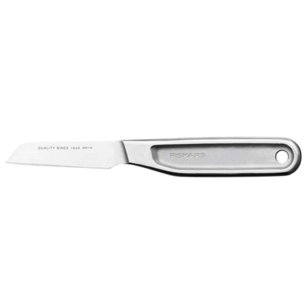 Fiskars visu veidu tērauda mizošanas nazis ar 7 cm garo asmeni ir ideāli piemērots mazu augļu un dārzeņu mizošanai un griešanai šķēlēs