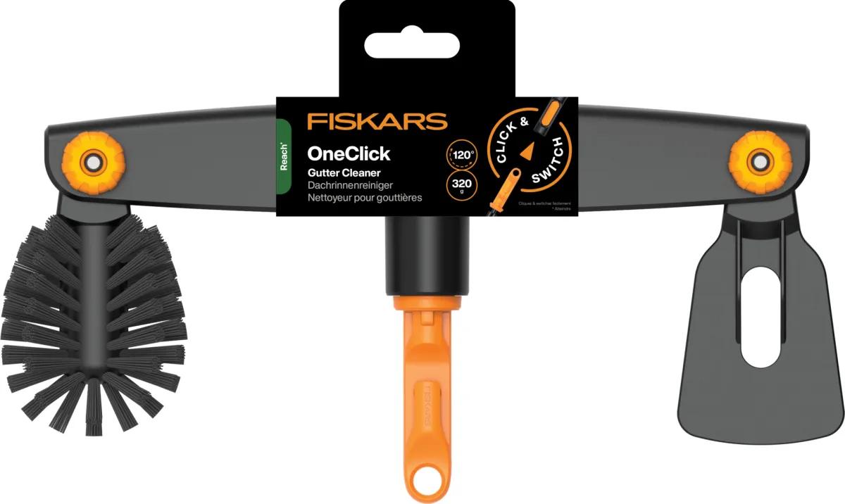 Fiskars OneClick notekcauruļu tīrītājs ir paredzēts efektīvai notekcauruļu apkopei tieši no zemes. Tas apvieno skrāpi rupju un uzkrātu netīrumu noņemšanai un noapaļotu suku galīgajai tīrīšanai. Pateicoties regulējamam darba galvas leņķim un teleskopiskajam rokturim, ar OneClick jūs varat ātri un bez riska, kas saistīts ar darbu uz kāpnēm, iztīrīt notekcaurules.