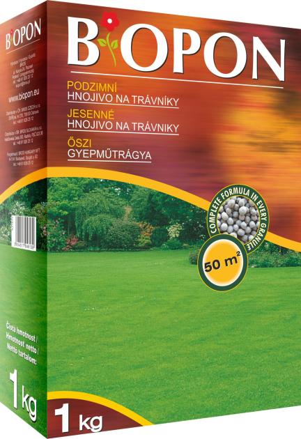 Biopon rudens zāliena mēslojums ir palīgmēslojums, kas nepieciešams, lai sagatavotu augsni rudens-ziemas sezonai. Šis mēslojums sastāv no daudzkomponentu granulām (komplekss sastāvs katrā granulā), tas ir ideāli piemērots zāliena mēslošanai. Slāpekļa trūkums ierobežo zāliena augšanu, tāpēc siltajā sezonā nav nepieciešama bieža pļaušana. Augstais kālija saturs palielina izturību pret salnām. Minerālmēsli papildinās barības vielu krājumus augsnē un veidos barības vielu rezerves, kas nepieciešamas nākamās sezonas veģetācijai.