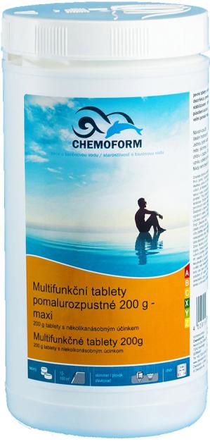 CHEMOFORM Daudzfunkcionālās tabletes Maxi 200g ar daudzpusīgu iedarbību, paredzētas ērtai baseina ūdens uzturēšanai.