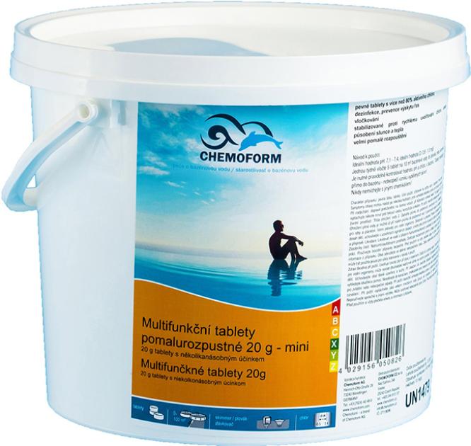 CHEMOFORM Daudzfunkcionālās tabletes MINI 20g ar daudzpusīgu iedarbību, kas paredzētas ērtai baseina ūdens uzturēšanai.