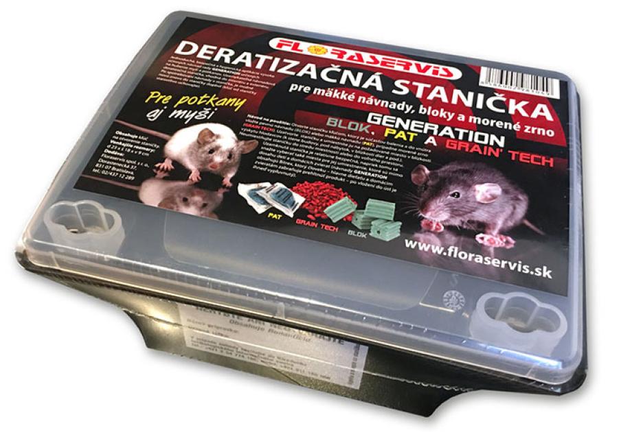 Deratizācijas stacija paredzēta žurku un peļu iznīcināšanai, bez uzpildes. Viegla, droša un higiēniska žurku iznīcināšanai paredzēto ēsmu izmantošana (ideāli piemērots GENERATION produktiem, ļoti efektīvām ēsmām pret pelēm un žurkām). Slēdzama ēsmu iznīdēšanas stacija, piemērota gan iekštelpās, gan ārpus telpām. Kad ēsma stacijā ir izlietota, jaunu ēsmu stacijā var atkārtoti iepildīt, izmantojot komplektā iekļauto atslēgu. Atveriet staciju ar iepakojumā iekļauto atslēgu un ievietojiet tajā cieto ēsmu - bloku vai mīksto ēsmu, vai marinētus graudus (mēs iesakām izmantot GENERATION produktus). Aizveriet staciju un novietojiet to vēlamajā vietā grauzēju tuvumā (pie ēkas sienas, zem mēbelēm, pie caurumiem utt.). Slēgta stacija ir salīdzinoši droša, jo to nav iespējams atvērt bez atslēgas izmantošanas. Palieliniet ēsmas stacijas drošību, izmantojot GENERATION produktus, kas satur Bitrex, kas neļauj cilvēkiem, jo īpaši bērniem un mājdzīvniekiem, norīt produktu, kas, ievietojot mutē, nekavējoties tiek izspļauts. Bitrex nodrošina augstu Generation produktu drošības standartu. Sastāvā ir iekļauta atslēga stacijas atvēršanai.