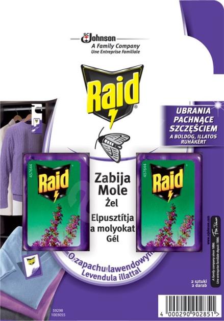 RAID gela āķi pret laputīm lavanda ir efektīvs līdzeklis, kas ne tikai atbaida, bet arī nogalina. mājoklī mītošās mājas mēles visās attīstības stadijās. Tas aizsargā jūsu apģērbu līdz pat trim mēnešiem. Tas atstāj jūsu veļu patīkami aromatizētu ar lavandas smaržu.