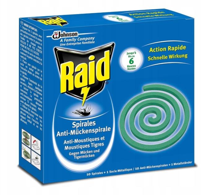 Raid spirālveida moskītu atbaidīšanas līdzeklis, iepakojumā ir 10 gab. + praktisks statīvs. Insekticīdās moskītu spirāles droši aizsargās jūs līdz pat 8 stundām, tās ir īpaši paredzētas lietošanai mājās. To ir viegli lietot. Tā neizdziest pat vieglā vējā. To patērē pēc vajadzības. efektīvs arī dārzos, uz terasēm, balkoniem vai kempinga laikā. Viena spirāle aizsargā līdz pat 10 m2 pat vēja ietekmē, tikai ļoti spēcīgs vējš var mazināt tās iedarbību.