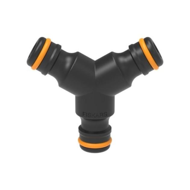 Ar Fiskars trīspusējo savienotāju var viegli sadalīt vienu ūdens padevi 2 atsevišķās jebkura diametra šļūtenēs.